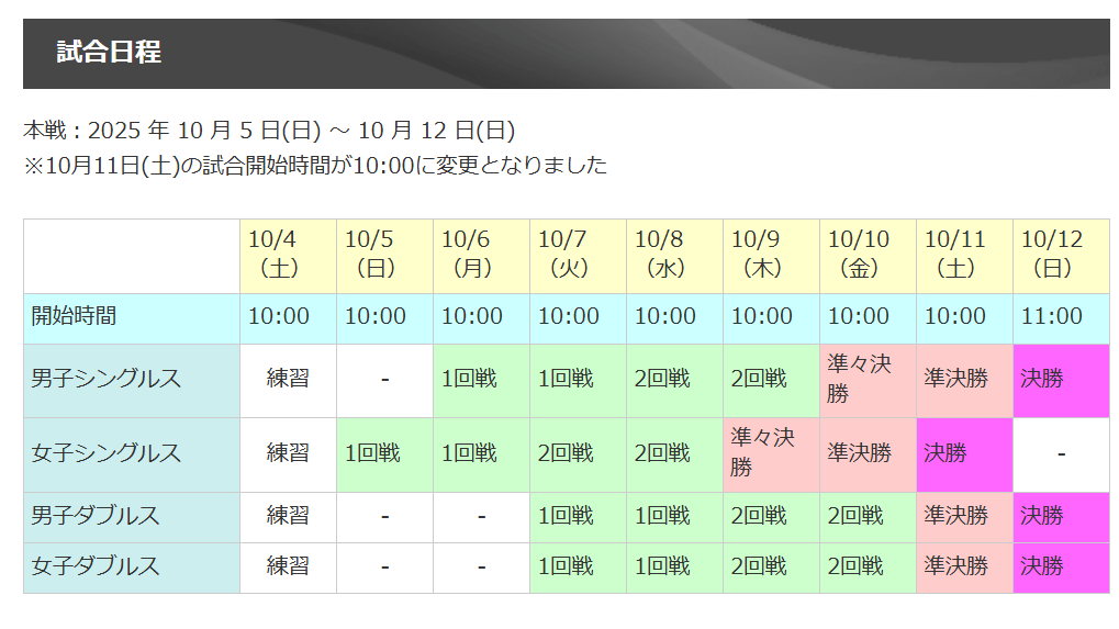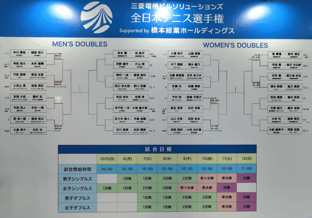全日本選手権は、例年10月上旬に本戦が、有明テニスの森公園(および有明コロシアムなど)を中心会場として行われます。2025年も本戦は10月5日~12日、会場は有明です。予選は9月下旬に、主に高崎・清水善造メモリアルテニスセンターで行われました。