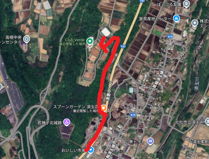 清里ラインの南側から来た場合、下図赤字の通りです。