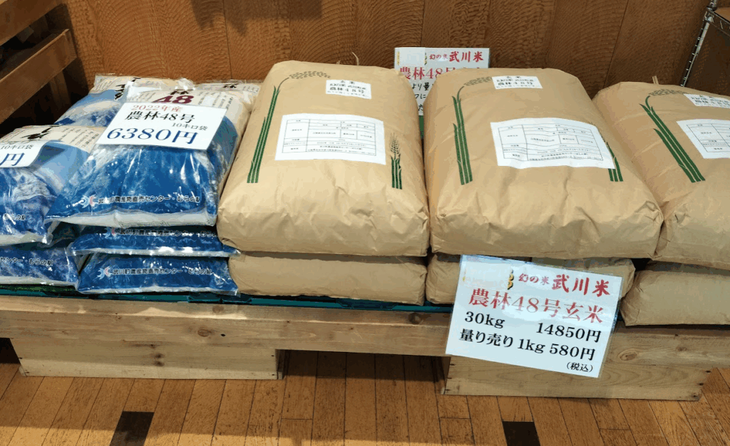 この近隣で買える武川米、農林48号はあまりにも有名。日本一の日照時間とされる地で育ったお米。マストバイです。