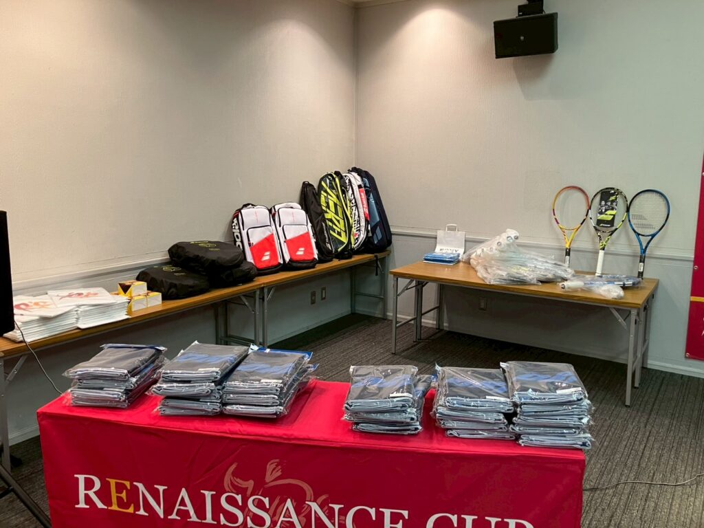 何と言っても目玉は賞品。非常に豪華です。奥のバボララケットの机、横置きにしているものもラケットです。バッグ、大きめタオルもたくさん。